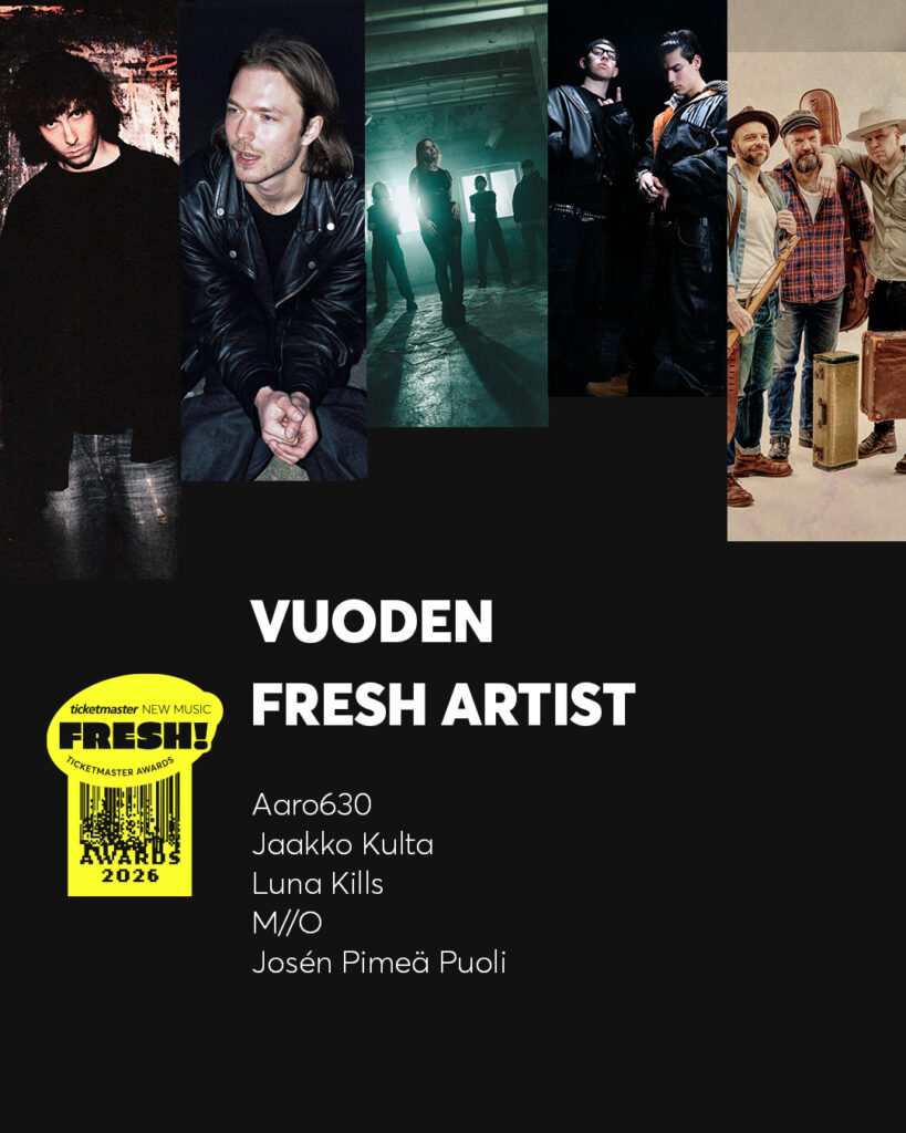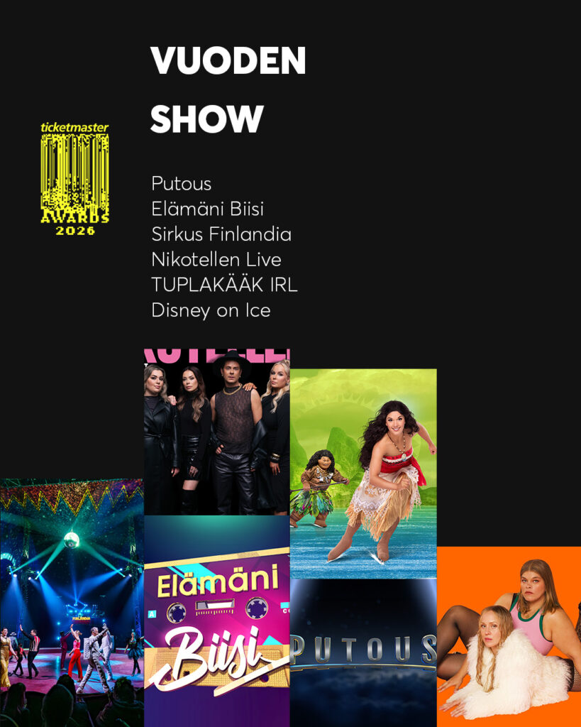 Äänestys on auki 26.1.–1.2.2026. Äänestäneiden kesken arvotaan kolme 100 € arvoista Ticketmaster Suomen lahjakorttia. Otamme yhteyttä voittajiin henkilökohtaisesti sähköpostitse. Arvontaan ja äänestykseen ei voi osallistua laillisesti Ticketmaster Suomeen sitoutuneet yritykset tai tahot.